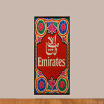 This vibrant Truck Art Wall Painting blends cultural artistry with modern branding. Featuring the iconic Emirates logo in both Arabic and English, the design is framed with bold floral motifs, colorful borders, and traditional Pakistani truck art patterns. The bright red backdrop symbolizes energy, hospitality, and passion, making it a stunning fusion of folk art and corporate identity.