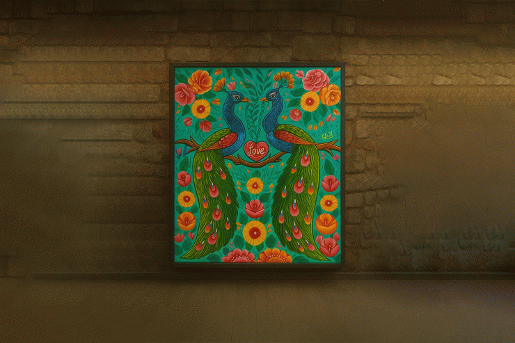Celebrate love, beauty, and tradition with this stunning Truck Art Wall Painting. Featuring two majestic peacocks facing each other with a heart inscribed with the word “Love”, the artwork is surrounded by vibrant flowers and lush patterns — a true reflection of South Asian folk art. With its rich colors, intricate detailing, and cultural symbolism, this painting not only enhances your décor but also conveys themes of romance, harmony, and joy. Perfect for bedrooms, living rooms, cafés, or art galleries, it’s a timeless piece that brings positivity to any space.